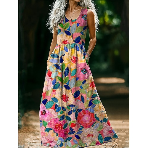 Per donna Abito maxi Abito Pieghettato Vacanza Casual Boho Spiaggia Feste Uscire Vestibilità regolare Floreale Grafico Senza Maniche Collo a U Blu Rosa Vino Marrone chiaro Estate Primavera
