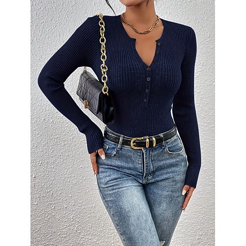 Per donna Maglietta A righe Classico Casual Manica Lunga Girocollo Top Regolari Quotidiano Uscire Bottoni Blu Nero Vino Marrone Bianco sporco Primavera Autunno