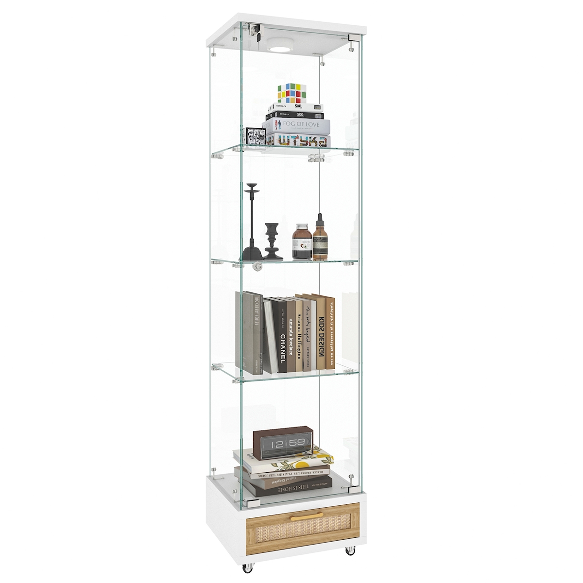 Merax Glasvitrine mit LED, Vitrinenschrank gehärtetes Glas, mit Schublade & Rollen, Standvitrine modern, H167×B42.5×T36.5 cm, Weiß