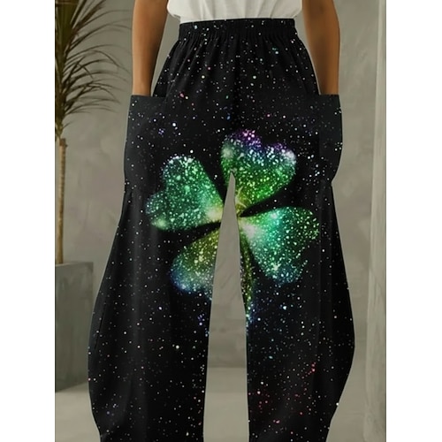 Damen Weites Bein Chinos Hosen Hose Urlaub Lässig Volle Länge Hohe TaillePantsSt. Patrick Tag Grafik Kleeblatt Kordelzug Tasche Elastischer Bund Bequem Atmungsaktivität Dehnbar Lässig Täglich Urlaub