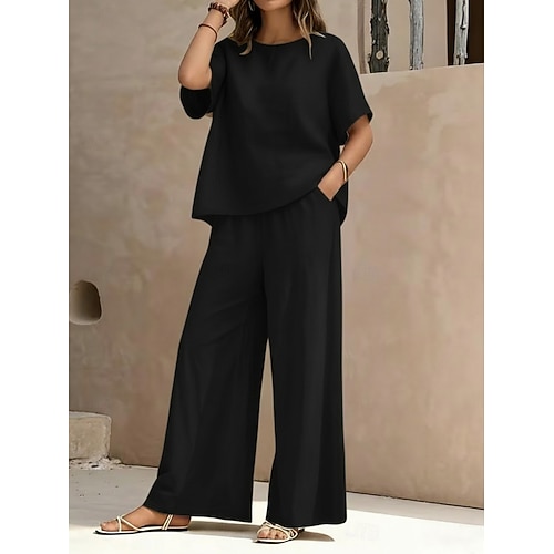 completi da donna in cotone e lino, completi da casa comodi e alla moda, tinta unita, arancione, rosso, blu navy, nero, bianco, verde scuro, primavera autunno