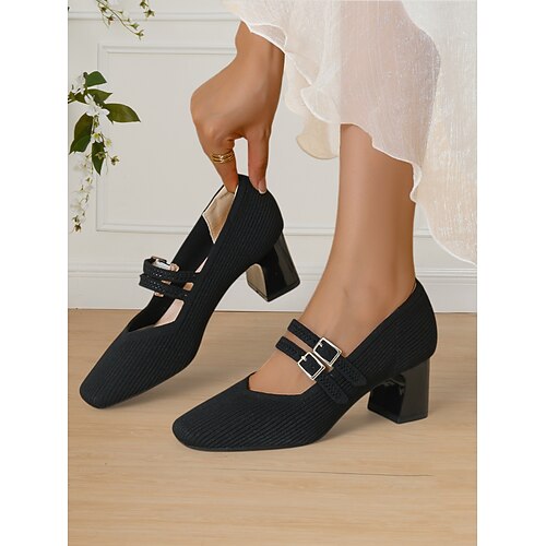 atmungsaktive Fly-Knit-Mary-Jane-Pumps mit doppelter Schnallendetail und klobigem Absatz, eleganter Stil für Damen, ideal für die Arbeit, Veranstaltungen und formelle Anlässe