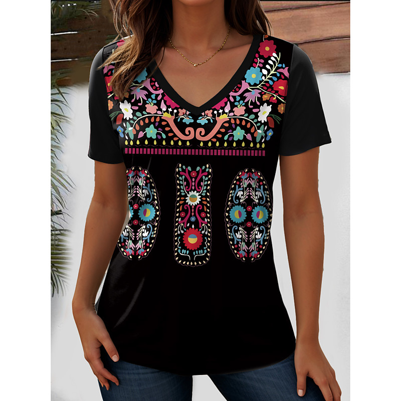 Women's T Shirt Graphic Geometric Paisley Bohemia Vintage Stylish Short Sleeve V Neck Regular Tops Daily Going out Beach Wear Print BlackWhiteRed Black White Red Purple Summer