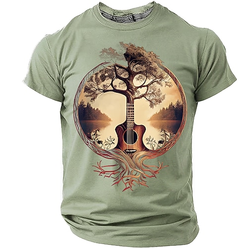 Maglietta da uomo con grafica albero della vita e chitarra acustica, tema natura, radici, surrealismo, musica, arte, folk, musicista, regalo, tramonto, paesaggio, stampa, casual, manica corta,