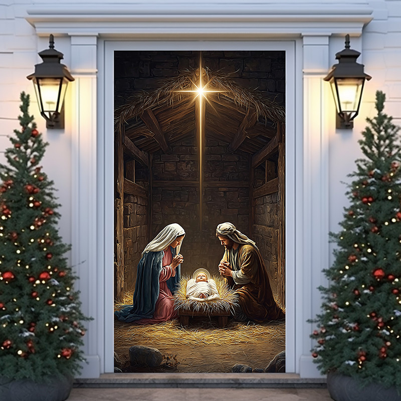 Christmas Door Cover Nativity Scene Design Holiday Curtain Hanging Backdrop for Home Entryway Decor Winter Theme Christmas Decoration for Festive Celebrations Xmas