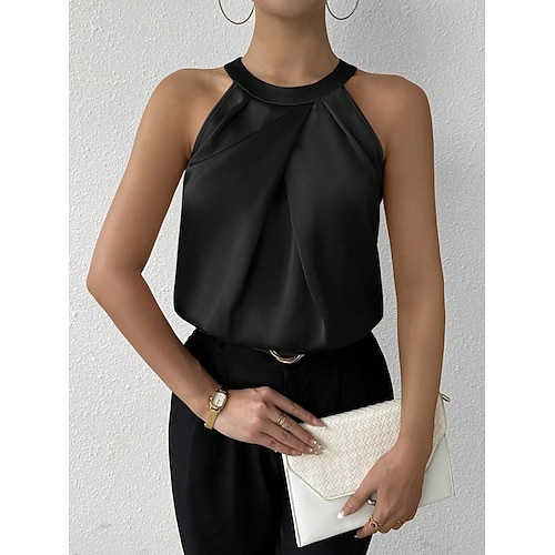 Per donna Camicia in raso Camicia con collo camp Tinta unica Elegante Essenziale Casual Senza Maniche All'americana Top Regolari Quotidiano Ferie Uscire Arricciato Nero Bianco Champagne Vino Verde
