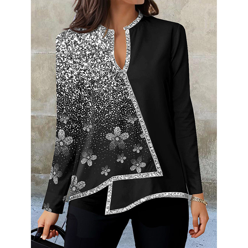 Women's 3D Print Blouse Long Sleeve Asymmetrical Hem Fashion Floral Print Asymmetric Hem Regular Tops V Neck Casual Holiday Black Silver Pink Blue Green Fall Winter