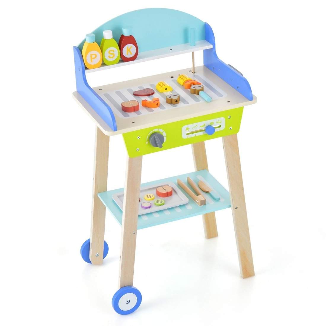 Legetøjsgrillsæt lavet af træ med skubbehåndtag & hjul & tilbehør legekøkken til børn grill