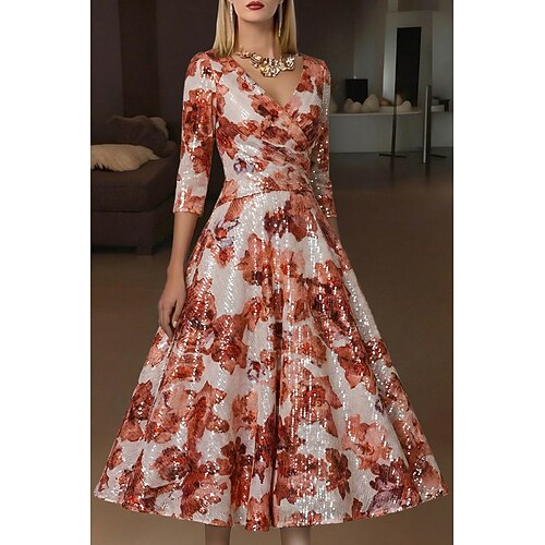 Linea ad A Lunghezza Tè Abito Formale Abiti da Cocktail Elegante Manica 3/4 Scollo a V Matrimonio Formale Con Paillettes con Stampa floreale Pieghe Paillettes