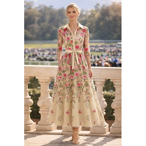 Linea ad A Abito Lunghezza alla caviglia Lunghezza Tè Abito da invitata a nozze Abito da cerimonia per signora Manica 3/4 Colletto a Camicia Elegante Vintage Formale Ospite di nozze Derby del Kentucky