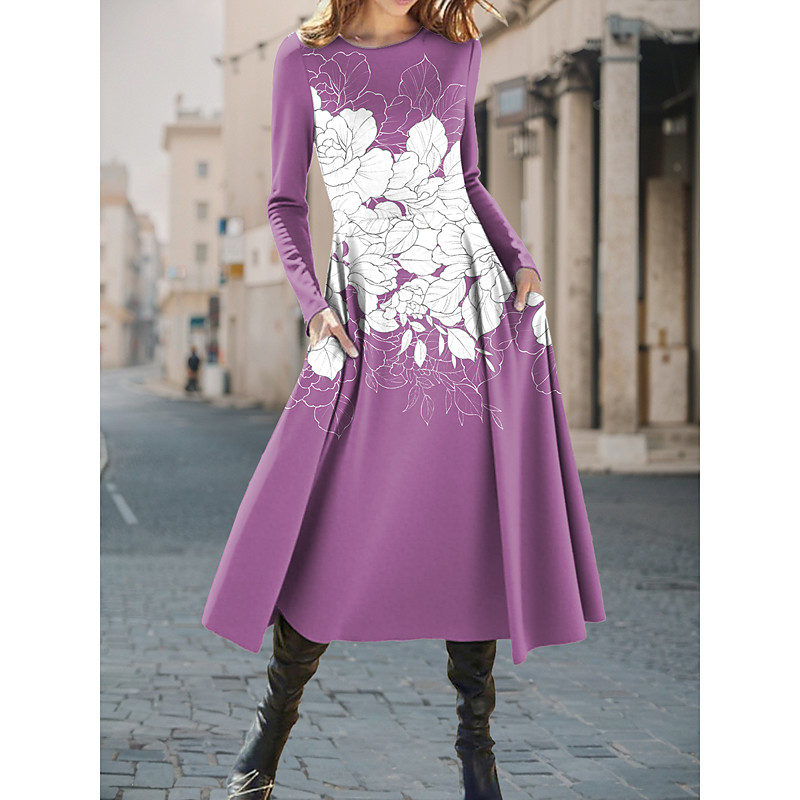 Women's Midi Dress A Line Dress Fit And Flare Dress Vacation Casual Daily Regular Fit Floral Graphic Long Sleeve Crew Neck Yellow Blue Purple Green Spring Fall Winter