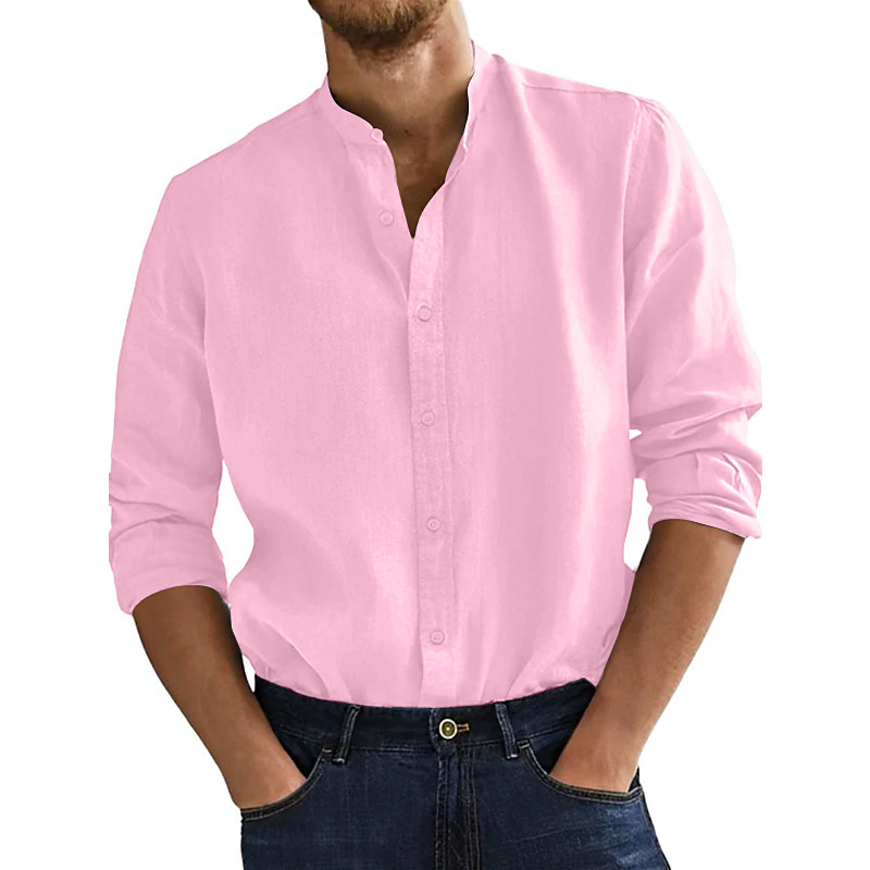 Men's Shirt Band Collar Shirt Summer Shirt Beach Wear Casual Shirt Button Up Shirt Solid Color Vacation Curise Black White Pink Orange Long Sleeve Collar Clothing Apparel