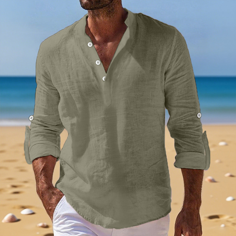 Men's Linen Shirt Band Collar Shirt Popover Shirt Casual Shirt Beach Shirt Plain Vacation Holiday Black White Pink Orange Long Sleeve Henley Summer Spring Summer Clothing Apparel