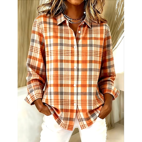 Women's Shirt Blouse Plaid Casual Long Sleeve Shirt Collar Regular Tops Daily Patchwork Buttons Print Blue Light Green Pink Red Orange Spring Fall Winter