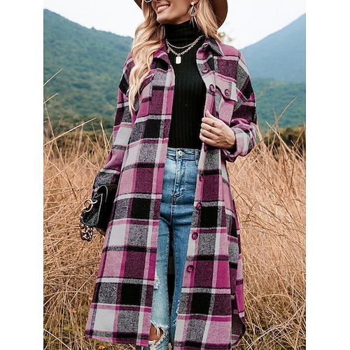 Women's Winter Coat Coat Warm Comfortable Pocket Open Front Casual Plaid Vacation Going out Weekend Long Turndown Regular Fit Long Sleeve Outerwear Black Brown Khaki Fall Winter