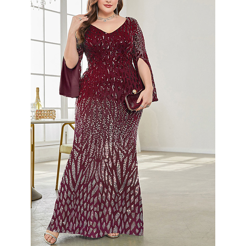 Plus Size Dress Mother of the Bride Curve Dress Elegant Party V Neck Floor Length Spandex Long Sleeve with Sequin