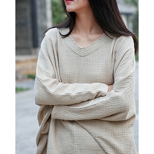 Per donna Camicie di cotone e lino Blusa Semplice Vintage Elegante Manica Lunga Manica a pipistrello Scollo a V Top Regolari Ferie Uscire Vino Verde Beige Autunno Inverno