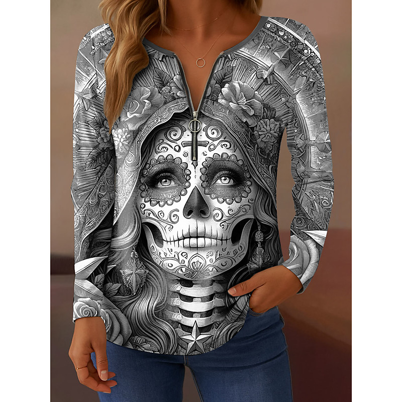 Women's T Shirt Skulls Graphic Vintage Stylish Casual Long Sleeve Round Neck Regular Tops Daily Weekend Zipper Print Yellow Pink Blue Gray Fall Winter