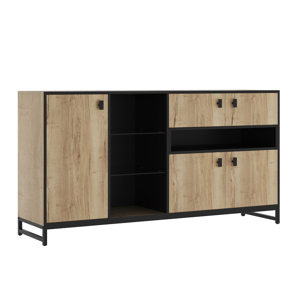Merax Sideboard mit LED, Schrank mit Doppeltüren, offenem Regal, Glasböden & verstellbaren Trennwänden, 160 x 40 x 84.5 cm, Natur
