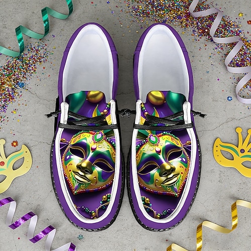 scarpe da barca slip-on da uomo a tema carnevale - scarpe casual con stampa in maschera viola e verde, comfort leggero per sfilate di carnevale, uscite ai festival, incontri informali e feste a tema
