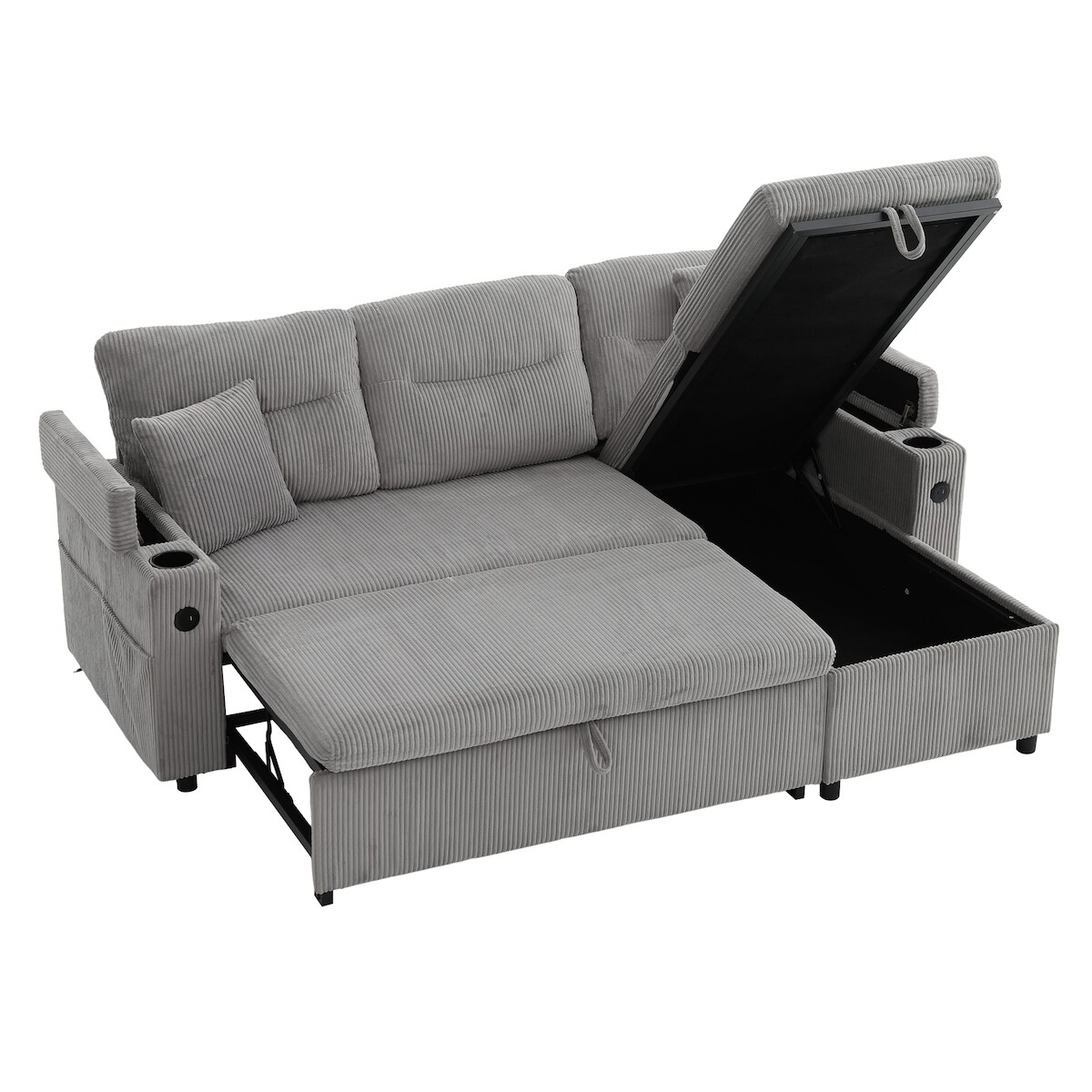 Merax 3-Sitzer Schlafsofa aus Leinen, mit Chaiselongues, Stauraum, Seitentasche, Getränkehaltern und USB-Anschlüssen, Hellgrau