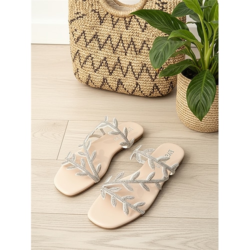 sandali bassi dorati da donna con cinturini a forma di foglia di strass: eleganti sandali in stile bohémien, comodi sandali slip-on per le vacanze estive in spiaggia e nei resort tropicali