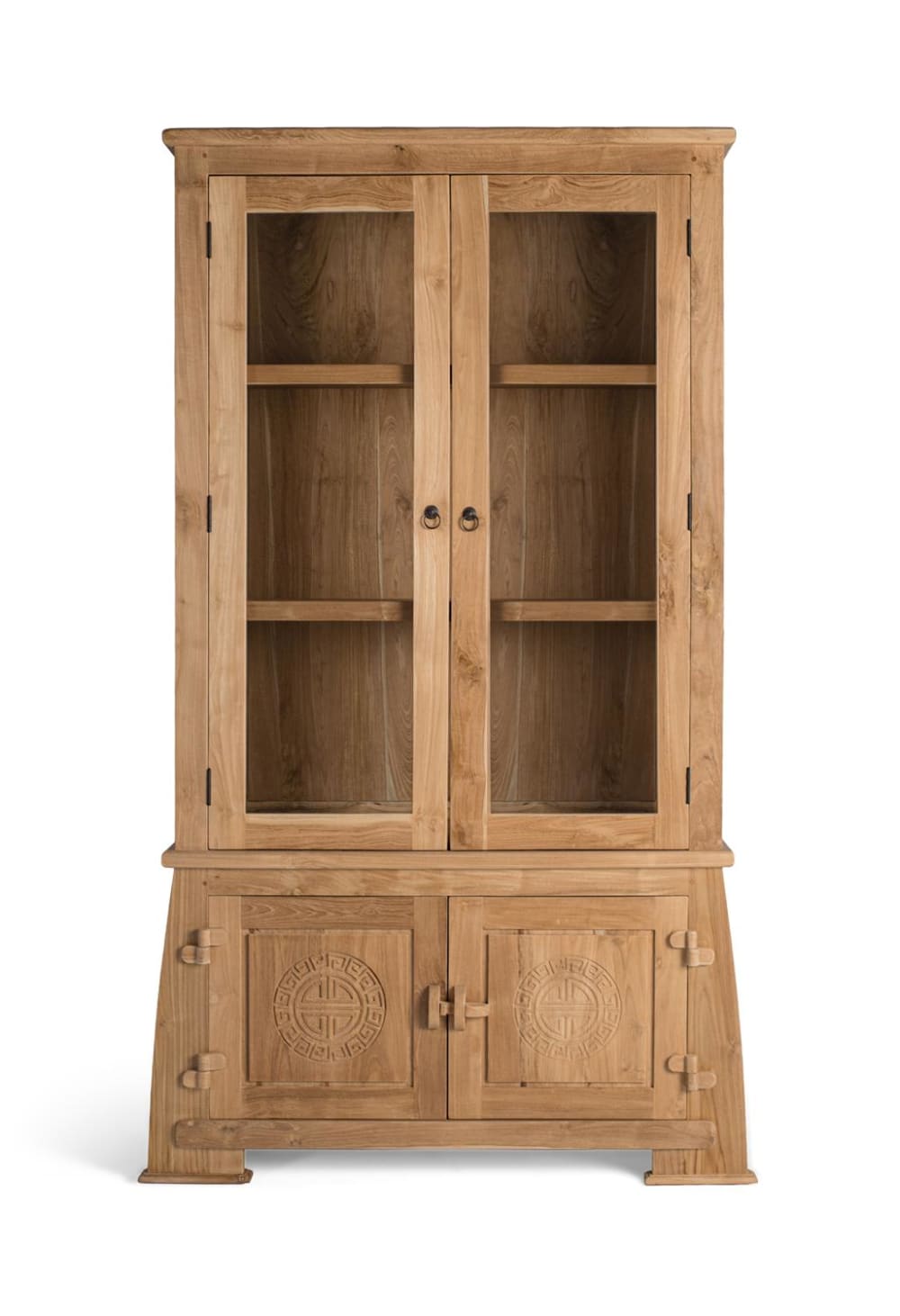 Vetrina in legno di teak con ante in vetro e intagli fatti a mano