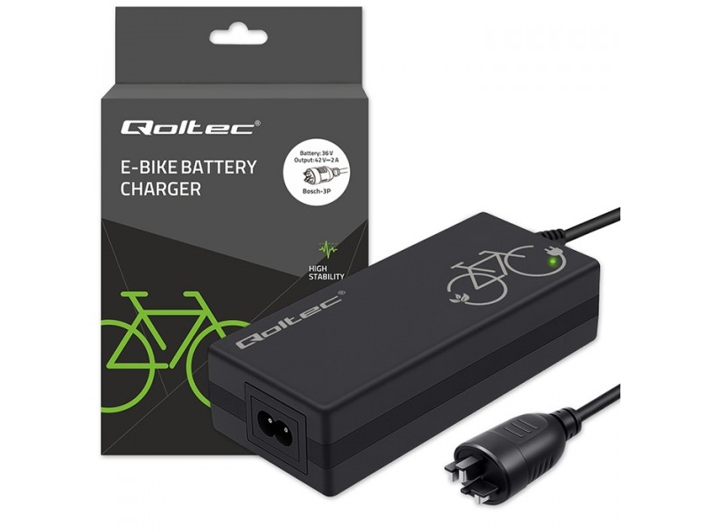 Qoltec Ladegerät für E-Bike 36V | 42V | 2A, Bosch 3Pin-Stecker + Netzkabel