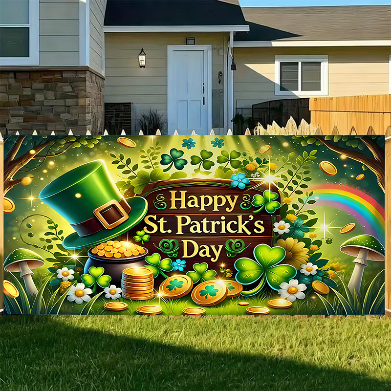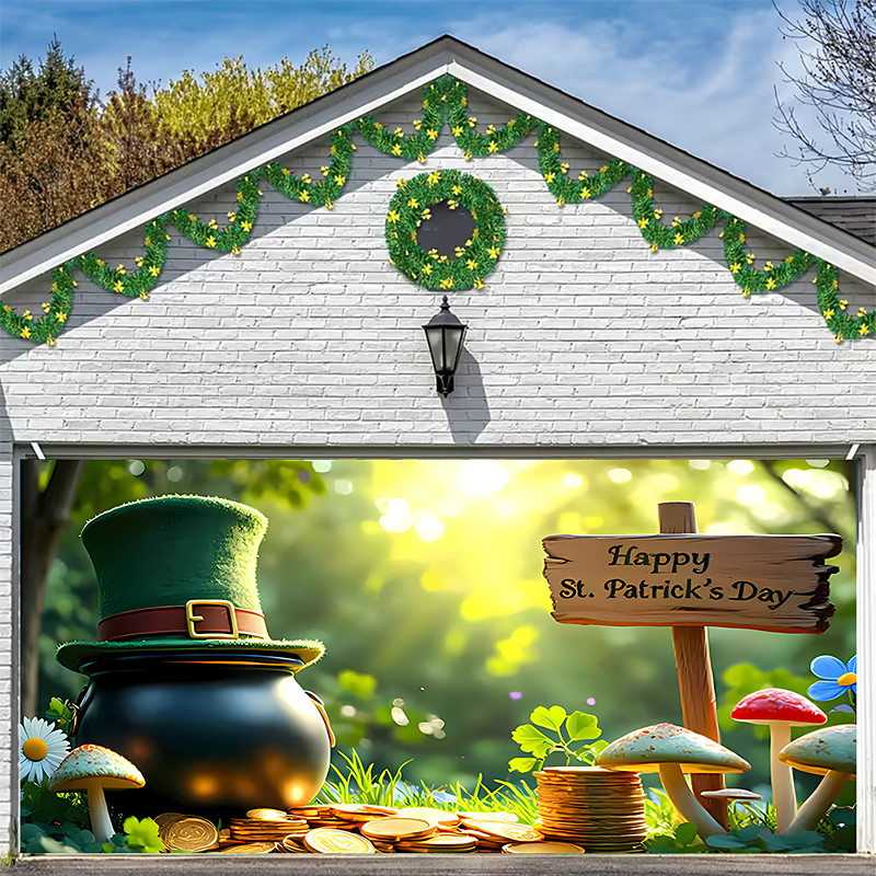 St Patrick's Day Garage Door Cover, Green Four-Leaf Clover Gold Coin Design, Festive Holiday Wall Banner, St. Patrick's Day Party Decoration for Garage or Home.