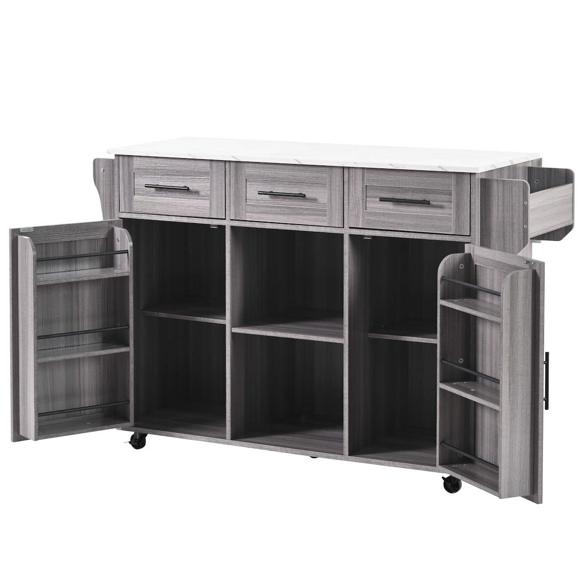 OKWISH Küchenwagen Servierwagen MDF Grau 92x120x71 cm klappbare Tischplatte mit 3 Schubladen Türen verstellbaren Einlegeböden Handtuchhalter Rollen
