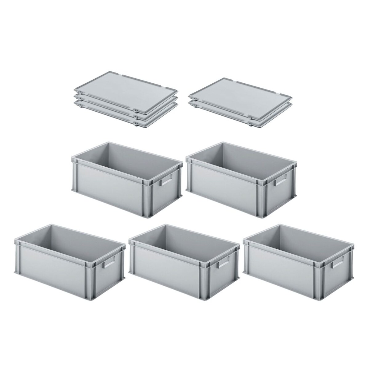 PROREGAL 5x Eurobehälter mit geschlossenem Griff und Scharnierdeckel | HxBxT 22x40x60cm | 38 Liter | Grau | Eurobox