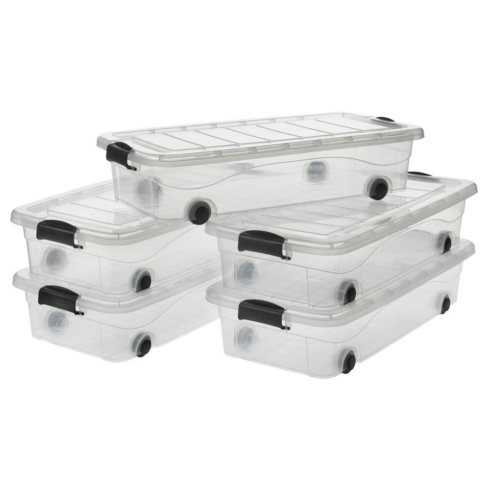 5 Stück Aufbewahrungsbox transparent 30 Liter mit Deckel und Klickverschluss 780 x 394 x 177 mm inkl. Rollen