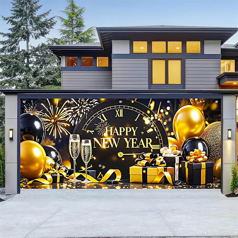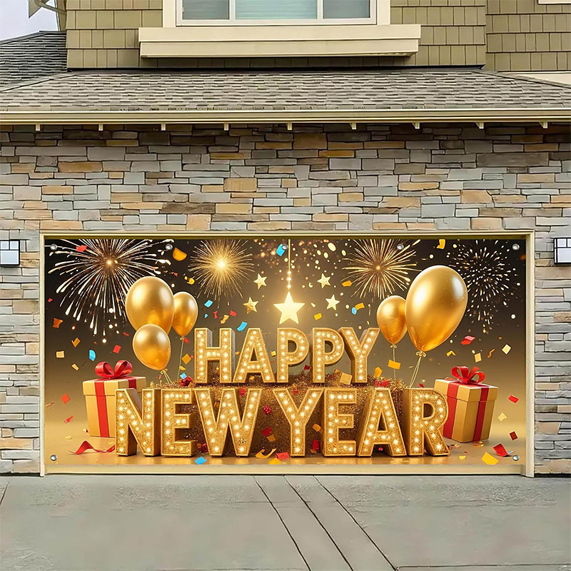 New Year Tapestry Garage Door Cover Large Hanging Backdrop Fireworks Cute 3D Party Outdoor Holiday Shooting Backgrounds Yard Home Decor