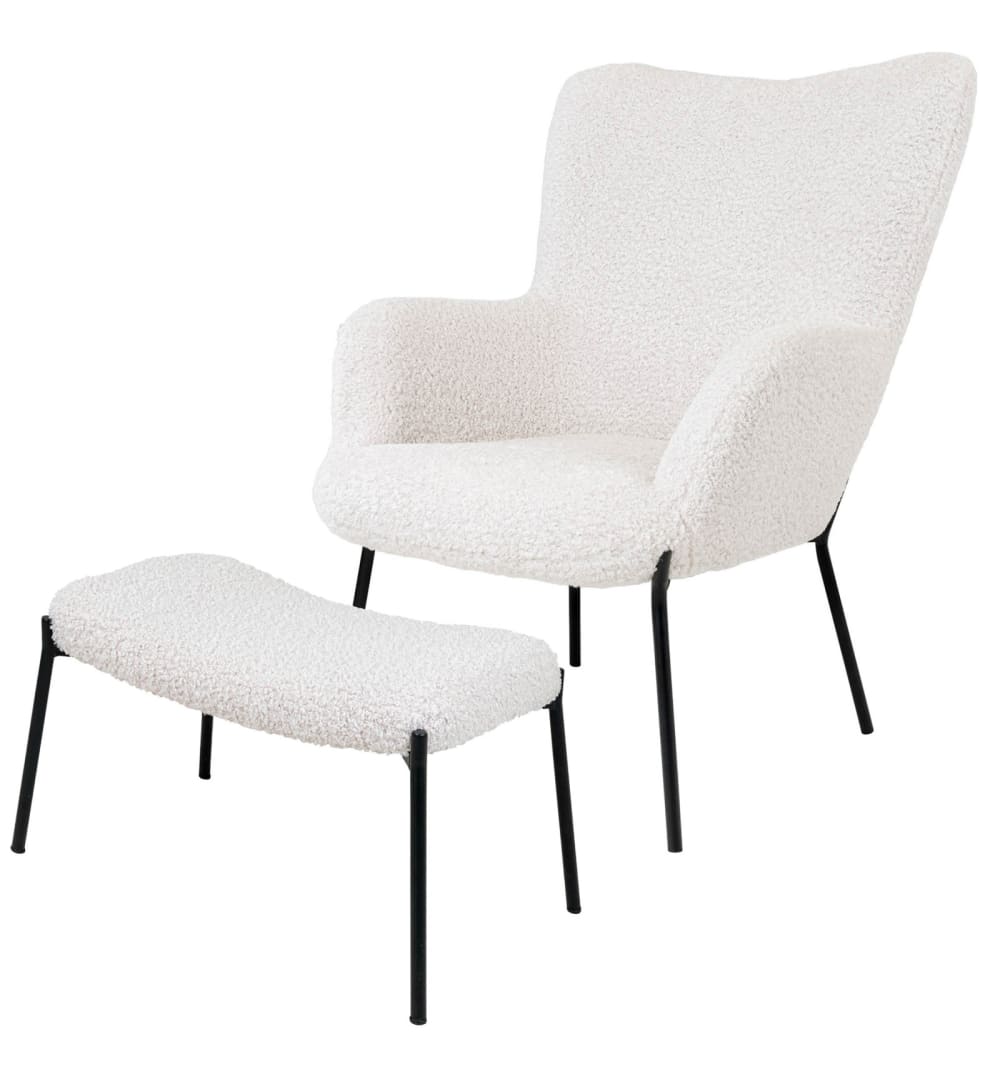 Poltrona e poggiapiedi vintage in tessuto bouclé ecrù