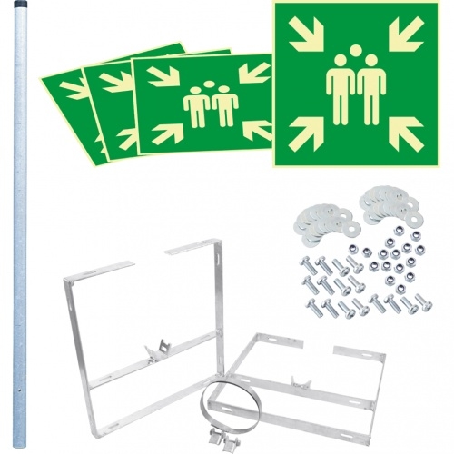 Vorteils-Set Sammelplatz PERMALIGHT power langnachleuchtend, Rettungszeichen, Rohrpfosten, -schelle