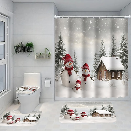 tenda da doccia in quattro pezzi, con sedile del water antiscivolo e robusto e tappetino per il bagno, motivo natalizio con pupazzo di neve e albero di Natale, materiale in poliestere impermeabile con