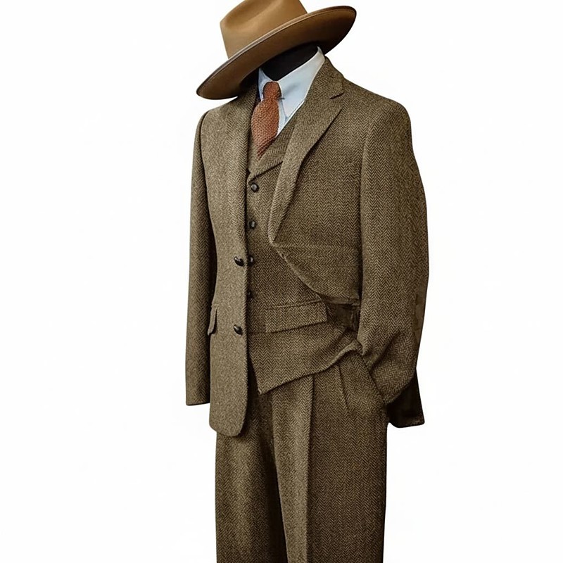 Men's Business Wedding Tweed Suits Notch Lapel Blue Light Khaki Business Retro Vintage Herringbone Tailored Fit 3 Piece Single Breasted Two-buttons