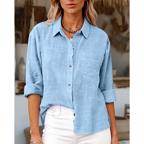 Per donna Camicia Blusa 100% cotone Semplice Vintage Casual Manica Lunga Colletto a Camicia Top Regolari Quotidiano Ferie Uscire Tasca Bottoni Nero Bianco Rosa Verde militare Blu marino Estate