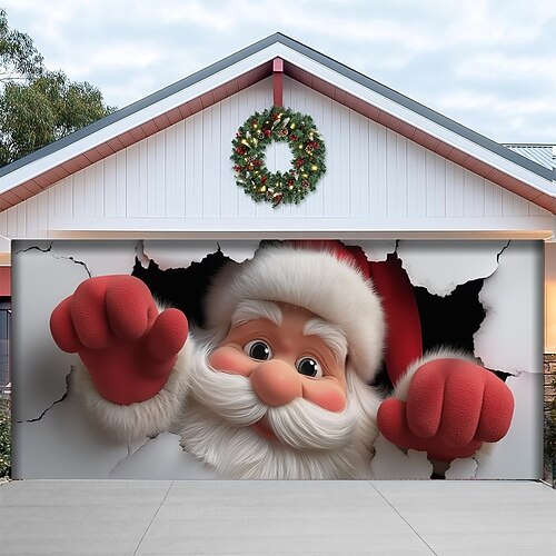 Copertura per porta da garage natalizia Babbo Natale che sfonda il muro grande sfondo da appendere all'esterno, striscione da parete per le feste in giardino, casa, decorazione 3D per feste, scena