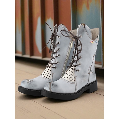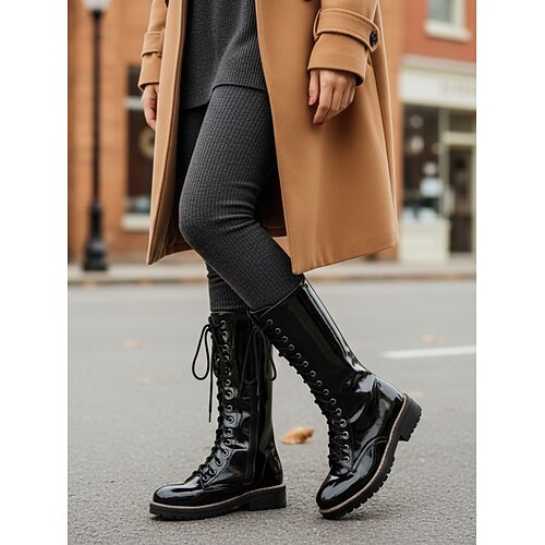 stivali da combattimento bianchi con lacci da donna, stivali classici casual preppy in pelle sintetica verniciata a metà polpaccio per ufficio, abbigliamento casual e attività all'aperto