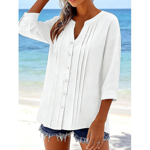 Per donna Blusa Top Eleganti Tinta unica Semplice Elegante Vintage Signore Manica 3/4 Scollo a V Top Regolari Quotidiano Lavoro Ferie Arricciato Patchwork Bottoni Marrone rossastro Nero Bianco Vino