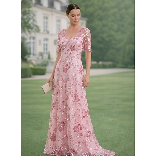 Serata Sirena/Tromba Lunghezza al pavimento Abito da Sera Abito da ballo con sopragonna Elegante Scintillante Floreale Manica Corta Scollo a V Festa serale Festa in giardino Chiffon Tulle con Fiore