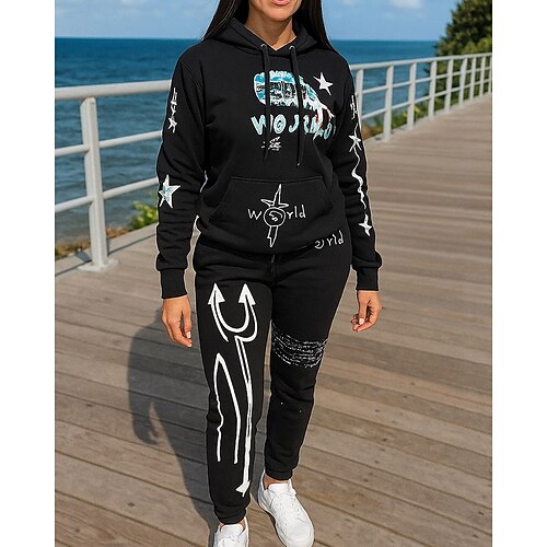 Per donna Tuta da 2 pezzi Felpa con cappuccio Lounge Set di tute da ginnastica Tasca Stampato Completo Abbigliamento Autunno Nero Bianco All'aperto Viaggio Sportivo Traspirante Manica Lunga Sport