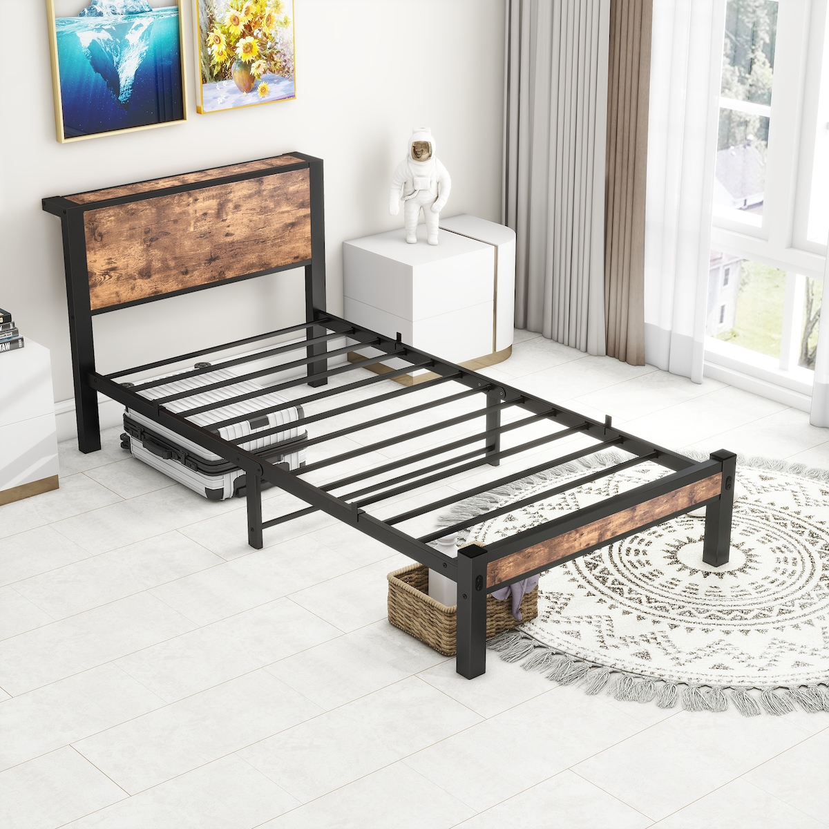 MODFU Metallbett 90x200 cm Einzelbettgestell mit Stauraum MDF-Rahmen Metall-Lattenrobust Vintage Braun Schlafzimmermöbel