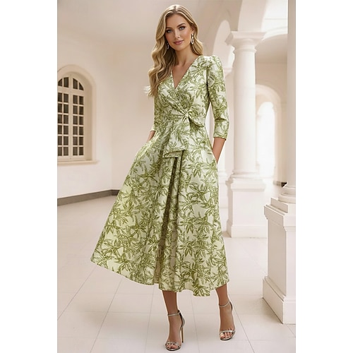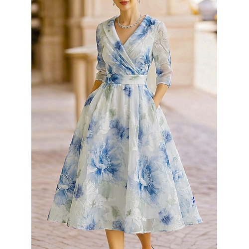 Linea ad A Lunghezza Tè Vestito da Festa Abito da Cocktail Abito da invitata a nozze Abito da cerimonia per signora Manica 3/4 Scollo a V Colletto a Camicia Elegante Vintage Formale Organza Jacquard