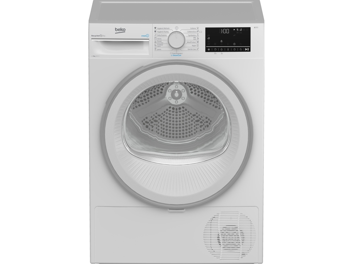 Beko B3T42242, Vapaasti seisova, Edestä täytettävä, Lämpöpumppu, Valkoinen, Rotaatio, Oikea