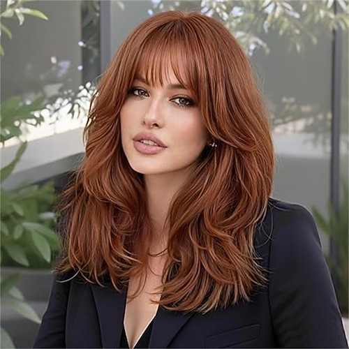 Hellbraune Damenperücke mit Pony, braun-blond gestufte, lockige Wellenperücke, Ombré-Strähnen in Braun, Kunsthaarperücke für den Alltag und Partys, 45 cm (18 Zoll).