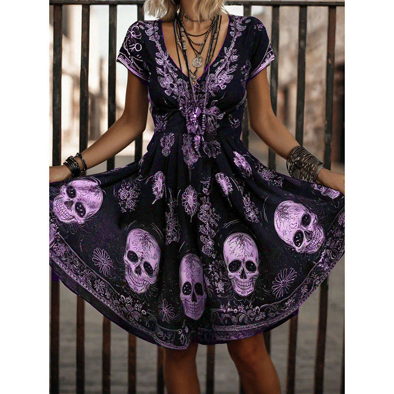 Women's Skulls Print Mini Dress Casual Dress T Shirt Dress Tee Dress Sundress A Line Dress Vacation Casual Boho Beach Graphic Skull Short Sleeve V Neck White Pink Blue Purple Spring