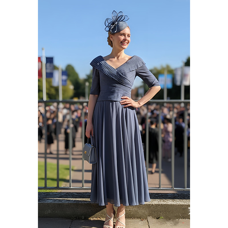 A-Line Ankle Length Tea Length Party Dress Cocktail Dress Wedding Guest Dress Mother of the Bride Dress Short Sleeve Half Sleeve V Neck Elegant Simple Formal WorkWear Chiffon Satin with Ruched