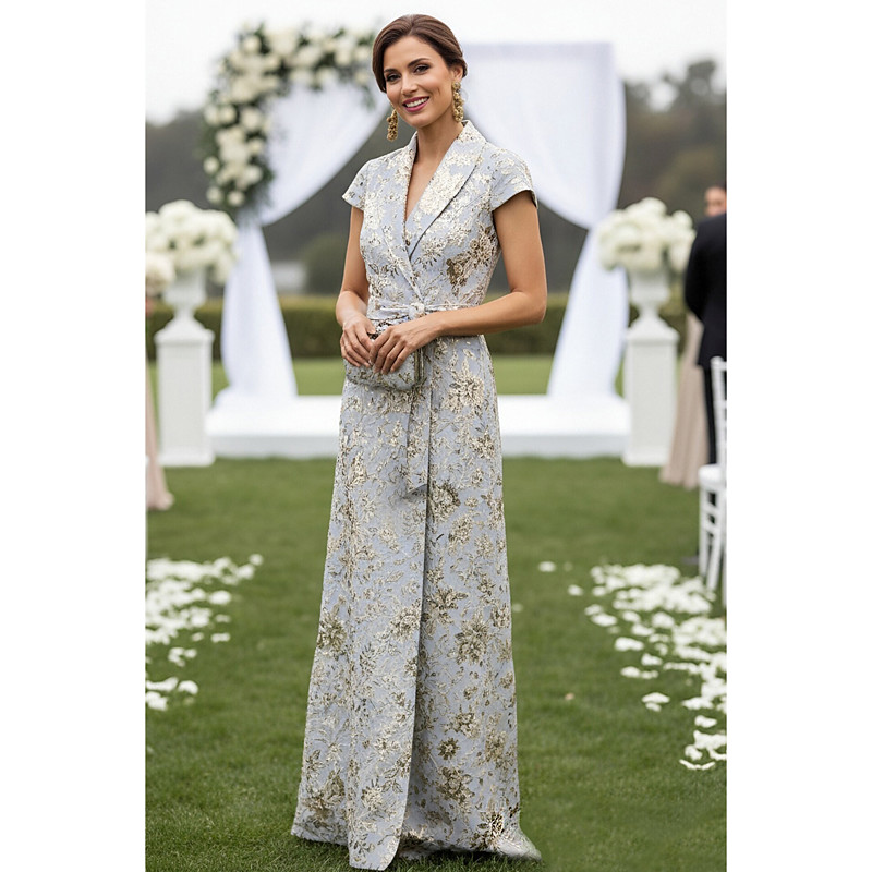 A-Line Floor Length Wedding Guest Dress Formal Dresses Evening Gown Mother of the Bride Dress Short Sleeve V Neck Lapel Elegant Vintage Formal Wedding Guest Jacquard with Bow(s)